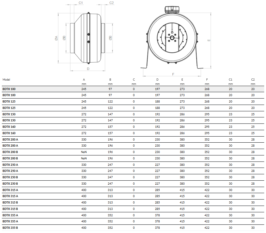 | Model | A | B | C | D | E | F | C1 | C2 |