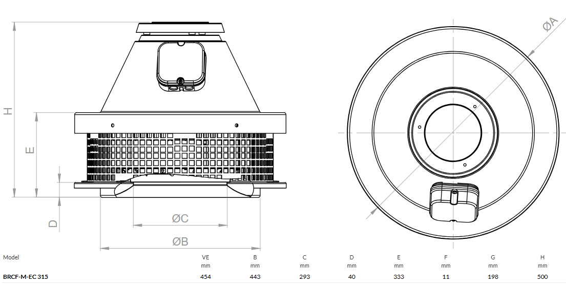 BRF EC serisi yatay santrifüj çatı vantilatörlerinin modelleri galvanizli çelik sacdan, 400-560 çaplı modeller ise alüminyum sacdan üretilmektedir. Tüm modellerde EC motor kullanılmaktadır. Motor hava akışına uygundur. Cihaz, maksimum 60ºC'de hava taşıma kapasitesine sahiptir.