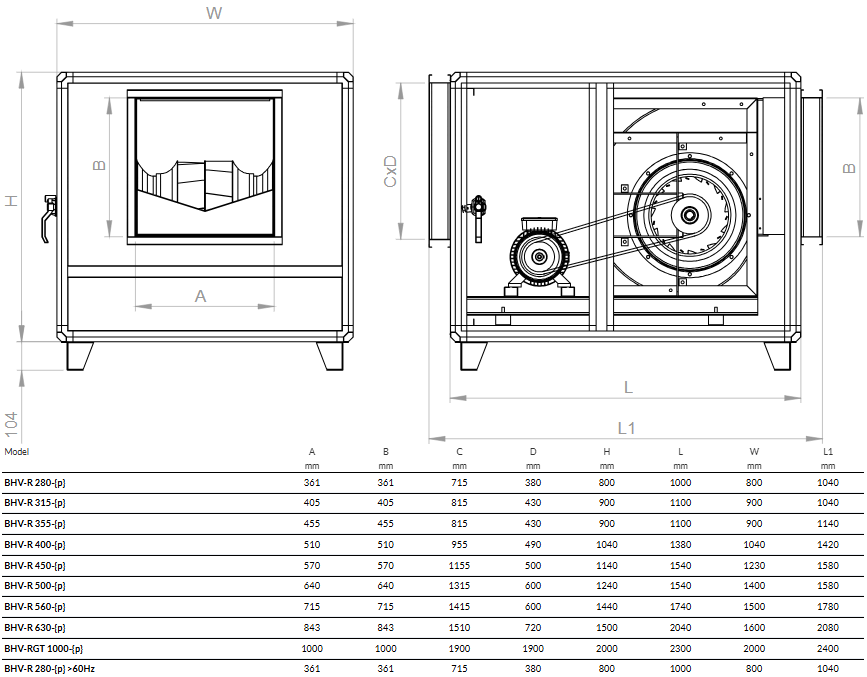 | BHV-R 280-{p} >60Hz | 361 | 361 | 715 | 380 | 800 | 1000 | 800 | 1040 |