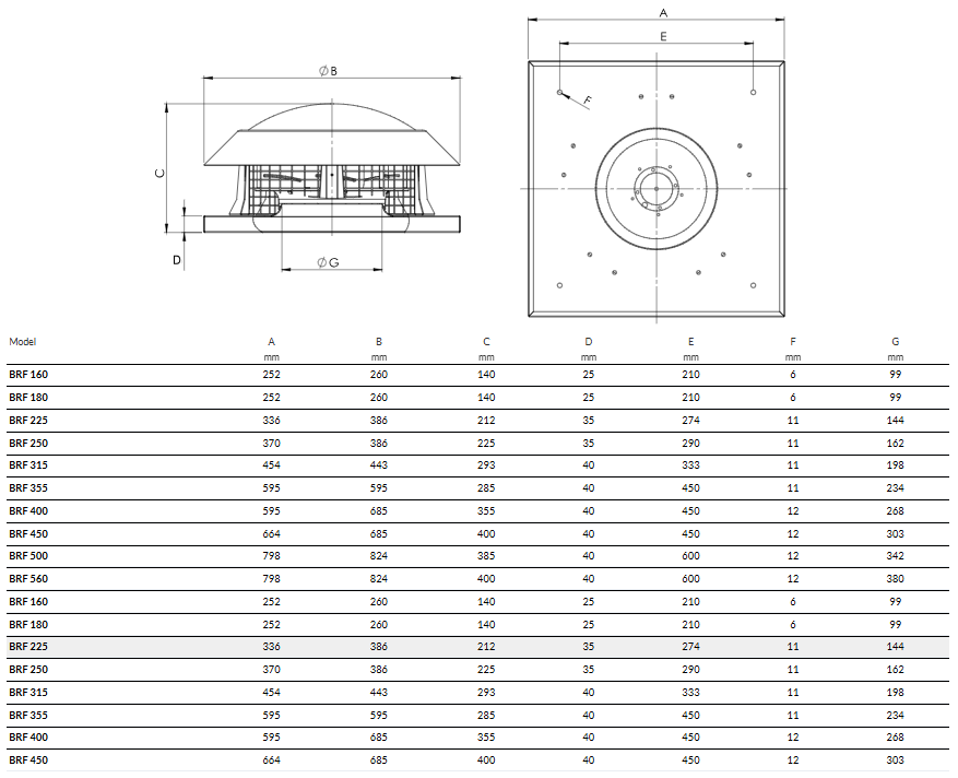 BRF serisi yatay atışlı çatı tipi radyal fanlarının montaj plakası ve fan şapkası elektrostatik toz boyalı sac metalden imal edilmiştir. BRF modellerin fanları korozyona karşı dirençli yüksek kaliteli galvaniz çelik sacdan üretilmiştir. Bütün modeller kapalı yapıya sahip dıştan rotorlu motora sahiptir. Cihaz max.40ºC sıcaklığında hava taşıma özelliğine sahiptir.